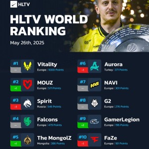 5月27日讯 今日,HLTV官方公布了新一期的世界战队排名,其中30连胜的Vitality毫无疑问继续霸榜榜首,而在IE...